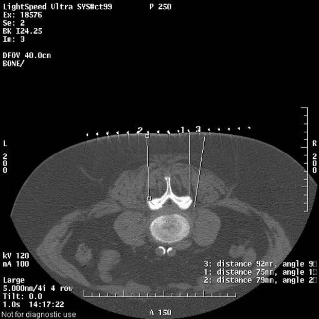 Durch die körperliche Untersuchung sowie der angefertigten Röntgenaufnahmen und Kernspintomographiebilder ist das Ausmaß sowie der genaue Ort Ihrer Wirbelsäulenerkrankung genau bekannt. Im Computertomogramm (CT) des mit unserer Praxis kooperierenden Radiologen wird das betroffene Wirbelsäulensegment mit der befallenen Nervenwurzel und den veränderten kleinen Wirbelgelenken (Facetten) eingestellt. Nun wird in Bauchlage eine kleine lokale Haut-und Stichkanalbetäubung durchgeführt.