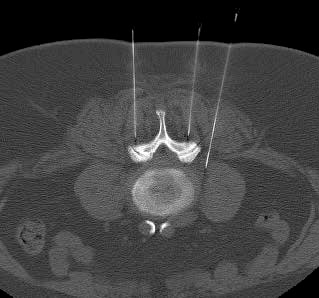 Anschließend wird die eigentliche Behandlungsnadel im genau vorgeplanten Winkel, in der richtigen Höhe der Wirbelsäule millimetergenau bis an Nervenwurzel und das Wirbelgelenk vorgeschoben. Dies ist nahezu schmerzfrei – man spürt „einen Druck“ im Rücken. Das anschließend angefertigte Kontroll-CT-Schnittbild zeigt eine korrekte Lage der Behandlungsnadel. Erst jetzt wird das Medikament exakt positioniert.